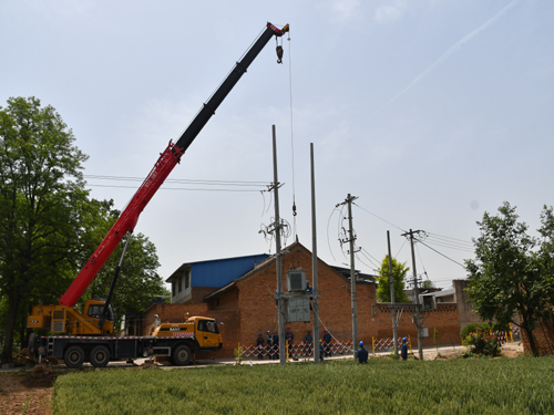 施工现场,大家各负其责,各司其职,有条不紊,工作人员首先对变压器进行有效拆除,对变压器进行绑扎,吊车师傅在工作负责人的指挥下,从旧配变台架上吊起变压器架设到新配变台架上,杆上的工作人员进行有效固定。随后,拆除旧杆上的横担及上下引线,在新杆上安装横担金具及上下引线,再接到变压器的桩头上。吊车师傅还将一根根电杆吊起固定立端,直至11基15米电杆立完才收工。