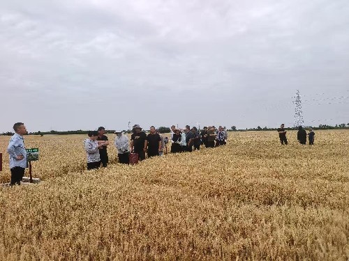 与会人员首先到油槐街办南杨村粮油示范基地,观摩以小麦宽幅沟播“3335”技术模式为主的小麦新优品种在抗病、抗逆、抗倒伏及产量方面的表现,成熟情况及特征特性,农技专家详细讲解示范情况并同参训人员共同探讨示范品种的优劣。