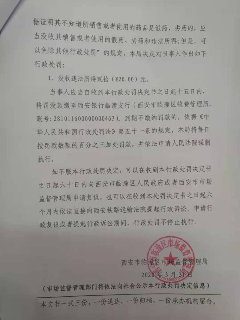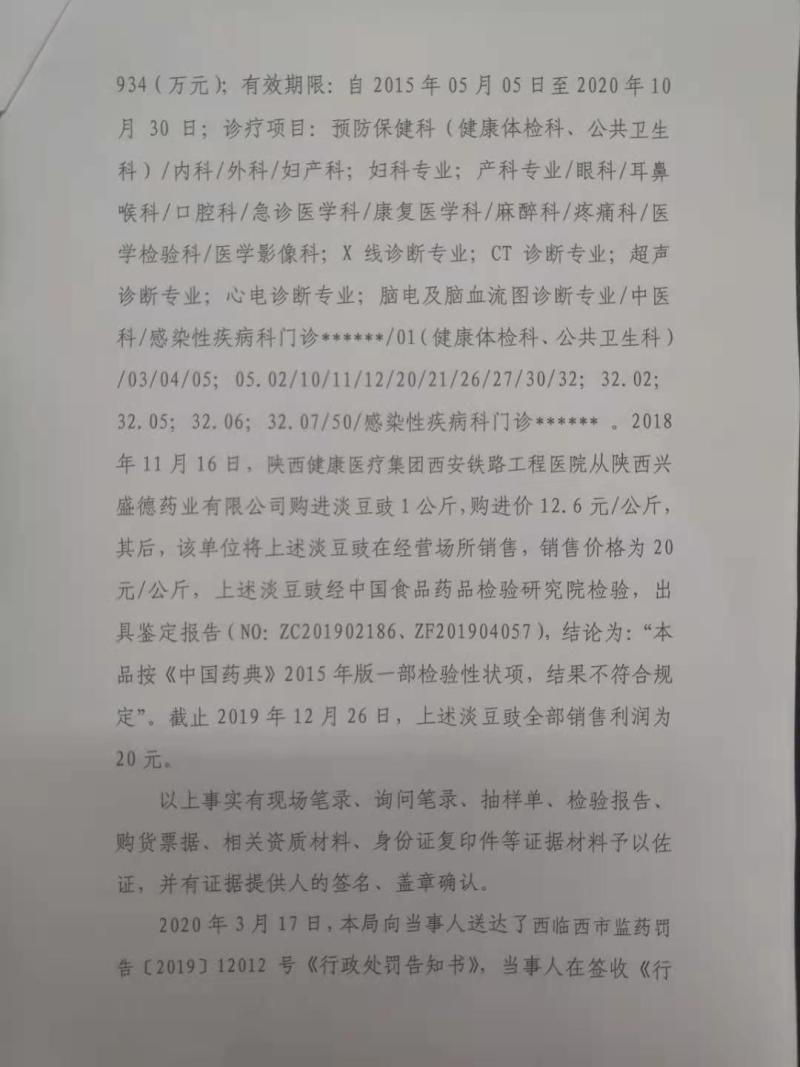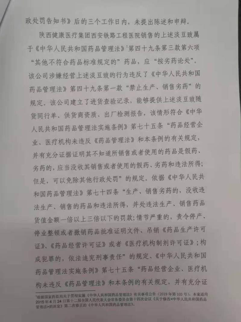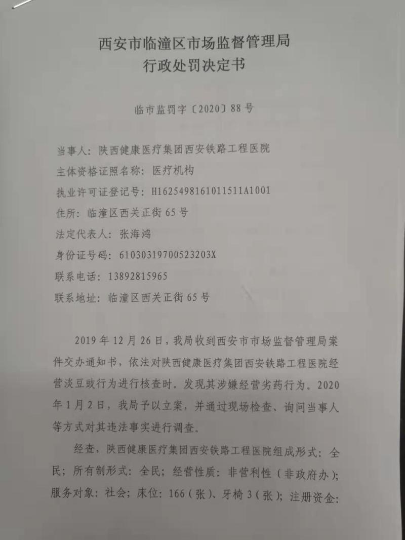 陕西健康医疗集团西安铁路工程医院使用劣药案行政处罚决定书