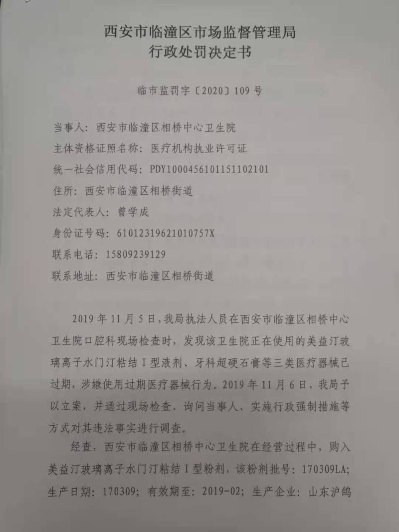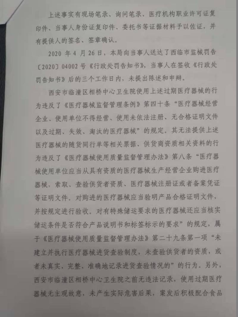 西安市临潼区相桥中心卫生院使用过期医疗器械案行政处罚决定书