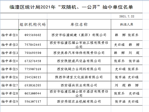 依据《中华人民共和国统计法》等相关法律法规规定,临潼区统计局依法在全区范围内开展统计执法检查。根据“双随机、一公开”监管工作的要求,利用陕西省“双随机、一公开”监管工作平台,从检查对象名录库中分专业随机抽取了9家检查对象。现将执法检查对象名单进行公示,具体检查时间及相关要求另行通知。