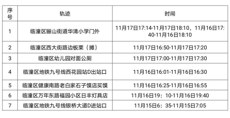 为及时有效阻断传播风险,请与以上高风险轨迹点位有时空交集的人员,立即向所属街道社区(村、单位)报备,并按要求配合落实疫情排查、核酸检测、隔离观察等防控措施。对隐瞒相关信息,拒不配合疫情防控工作的,将追究其法律责任。