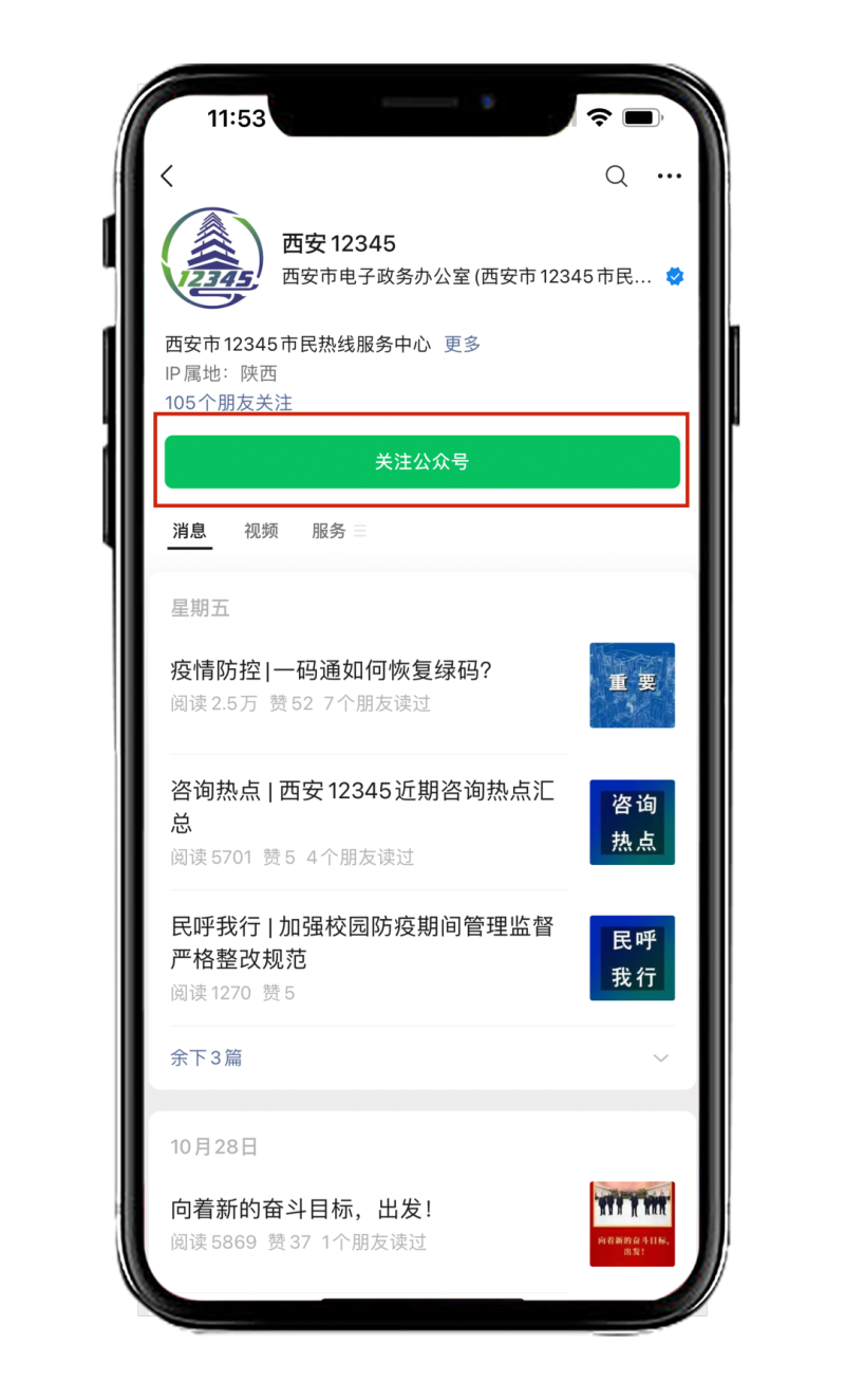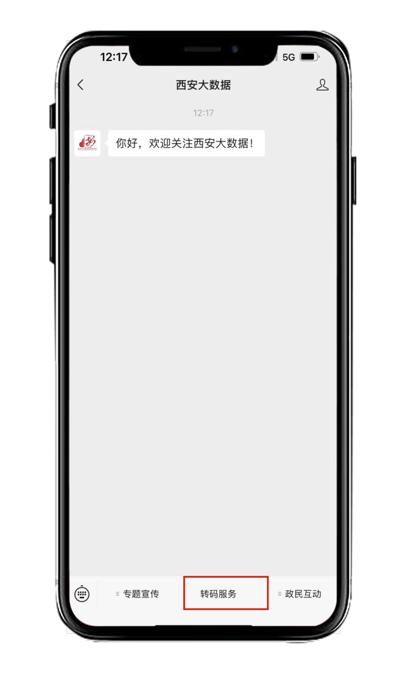 第一步:微信搜索关注“西安大数据”或者“西安12345”微信公众号。(如下图所示)