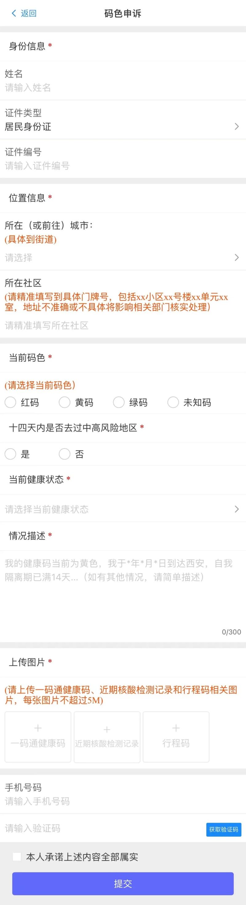 第四步:在“码色申诉”页面填写本人的基本信息及申诉信息,包括位置信息(区县含以下)、当前码颜色、当前赋码原因、本人目前情况等,上传申诉转码所需的证明材料,包括“一码通”截图、核酸检测记录、通信大数据行程卡等。(如下图所示)