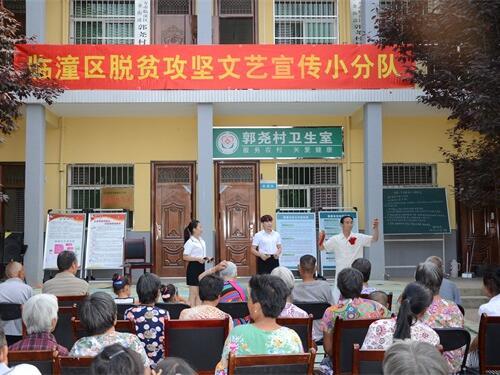 一是编制《村规民约》。以简单易懂的顺口溜形式编制了《村规民约》,向群众宣传国家法律法规政策、扶贫知识、乡风民俗等等,传播正能量,振奋脱贫精神。二是组织文艺表演。联系区脱贫攻坚文艺宣传小分队给郭尧村群众带来丰富精彩的文艺表演,上百名群众参加了活动。小分队将脱贫攻坚知识政策融入快板、戏曲、歌曲等文艺形式当中,演出中间还穿插扶贫政策有奖问答、演员群众一起唱歌等互动环节,让群众在欢歌笑语中掌握了解扶贫政策,提高群众的知晓率和满意度。