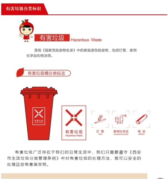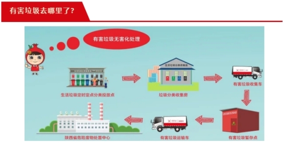 关于有害垃圾的无害化处理,西安市有着一整套严密高效的处理流程。居民在定时定点分类投放后,物业会将分类好的有害垃圾转入垃圾分类收集房,紧接着有资质的单位会通过有害垃圾收集车将其运送至有害垃圾暂存点,最后统一运输至陕西省危险废物处置中心进行无害化处理。