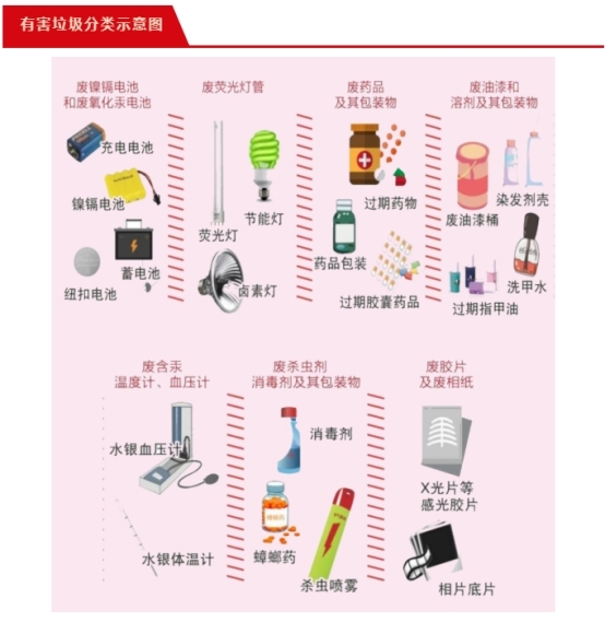我们日常接触到的有害垃圾大致分为电池类、含水银类、灯泡类、化学品类、废胶片及废相纸类。其中要注意的是,过期的化妆品、指甲油、修正液、废药品还有大部分的清洁剂、杀虫剂等有害垃圾,需要密封后连带包装一起投放。此外,普通一次性干电池(5号、7号电池)属于其他垃圾,千万别投放错了!