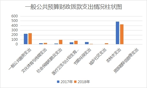 2018年,我街办一般公共预算财政拨款支出共907.17万元,其中一般公共服务支出共236.28万元,文化体育与传媒支出32.12万元,社会保障和就业支出98.85万元,医疗卫生与计划生育支出77.30万元,节能环保支出9.99万元,城乡社区支出24.58万元,农林水支出426.70万元,资源勘探信息等支出1.35万元;2017年,一般公共预算财政拨款支出共859.05万元,其中一般公共服务支出228.37万元,文化体育与传媒支出27.33万元,社会保障和就业支出17.41万元,医疗卫生和计划生育支出46.65万元,节能环保支出52万元,农林水支出487.29万元。