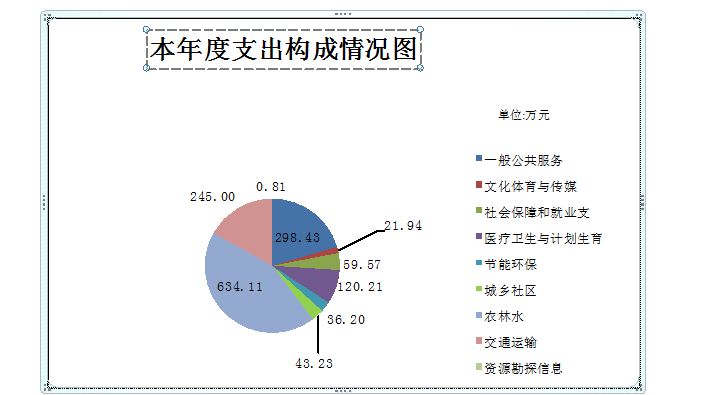 2.本年度总收入1291万元,其中一般公共服务收入291.35万元,文化体育与传媒收入98.35万元,社会保障和就业收入207.31万元,医疗卫生与计划生育收入164.56万元, 节能环保收入20.91万元,城乡社区收入111.28万元,农林水收入397.24万元