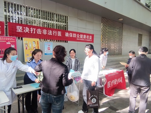 为保障人民群众健康权益,深入宣传非法行医严重危害,提高群众识别非法行医行为的能力,自觉抵制非法行医,2024年4月18日,西安市临潼区卫生健康局组织区卫生计生综合监督所、区120急救中心、区人民医院、区中医院、区妇幼保健院5家单位开展打击非法行医宣传活动。