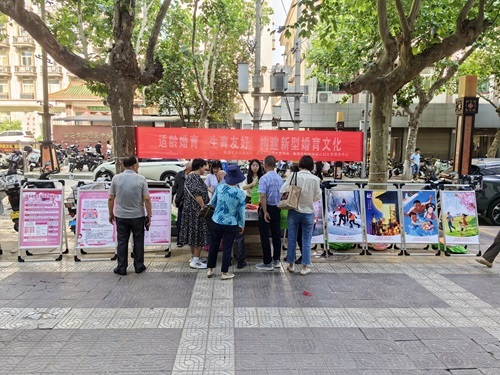 5月23日,临潼区卫生健康局联合区计生协会、骊山街办、区妇幼保健院、区中医医院及辖区托育机构在南大街集中开展“适龄婚育,生育友好构建新型婚育文化”主题宣传活动。