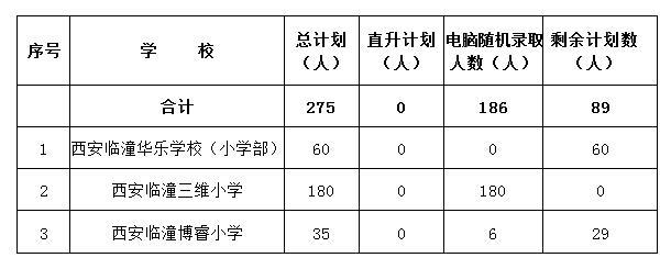 根据《西安市教育局关于做好2022年义务教育学校招生入学工作的通知》(市教发〔2022〕76号)的要求,我区民办小学招生计划数共275人,2022年7月24日电脑随机录取186人,剩余计划数89人,现公布如下(具体见下表):