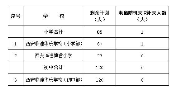 根据《西安市教育局关于做好2022年义务教育学校招生入学工作的通知》(市教发〔2022〕76号)的要求,我区民办义务教育学校申请补录剩余招生计划,经市教育局核准,2022年7月27日对我区民办小学剩余招生计划89人,民办初中剩余招生计划120人进行电脑随机录取补录工作,现将补录结果公布如下(具体见下表):