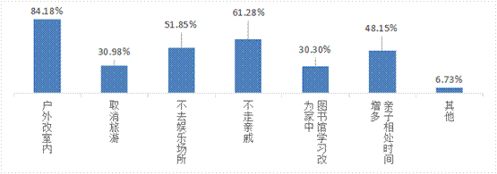 1.游玩计划改变了。寒假虽然天气寒冷,但是有一些户外春节娱乐活动可以参加,有84.8%的家庭将原计划的户外活动改成了室内活动;还有31.%的家庭原有带孩子出去旅游的计划,也被迫取消;寒假最多的时间是逛旅游景点和逛综合商城,能够放松自我的娱乐项目非常吸引孩子,是一学期紧张生活后的向往,51.9%的家长取消了孩子的娱乐场所玩乐放松的计划;同时61.3%的家庭有带孩子走亲戚的习惯,也被迫取消。