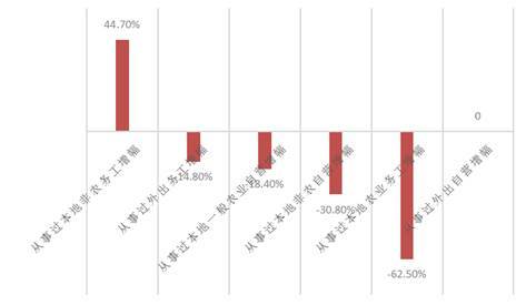 现今农业机械化生产普及,将农村农民从繁重的农业生产中解放出来,农业务工劳动时间长但收入低,因此农闲时间农民会选择本地非农务工来补贴家用,从事过本地农业务工的人数减少,从事过本地非农务工的人数增加。数据显示:从事过本地非农务工的人数55人,同比增加44.7%;从事过外出务工的人数75人,同比减少14.8%;从事过本地一般农业自营的人数40人,同比减少18.4%;从事过本地非农自营的人数9人,同比减少30.8%;从事过本地农业务工的人数3人,同比减少62.5%;从事过外出自营的人数2人,与上年相同(见图2)。