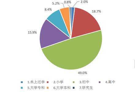 2.农民工文化水平普遍较低。从调查结果可以看出,就业人口文化程度普遍偏低,以初中文化程度为主(见图3)。