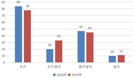 受新冠肺炎疫情影响,临潼区农民工偏向选择离家近的就业地点务工,省外的务工人员选择回省择业,以降低疫情反弹而导致不能回家的风险。调查数据显示:全年乡内从业84人,占从业人数的52.2%,同比增加7.7%;乡外县内从业20人,占从业人数的12.4%,同比减少39.4%;县外省内从业47人,占从业人数的29.2%,同比增加4.4%;省外从业10人,占从业人数的6.2%,同比减少9.1%(见图1)。