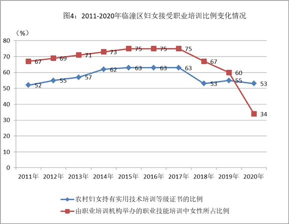 2、妇女接受继续教育和培训机会得到保障。十年来,全区通过就业培训、扶贫培训等方式,完成妇女培训1.1万余人次,妇女接受继续教育和职业培训的机会始终得到充分保障。而“农村妇女持有实用技术培训等级证书的比例”一度超过了60%, “由职业培训机构举办的职业技能培训中女性所占比例”更是一度达到了75%,但随着农村留守妇女人员减少,参加技能培训的妇女人员有限;2020年新冠疫情的爆发,使得部分以妇女为主要培训对象的培训如家政服务、手工钩织、保育员等无法开展,导致这两项指标在2020年有所下降,未达到《规划》要求。