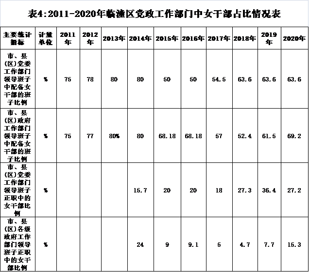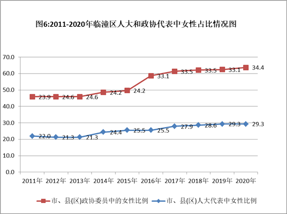 1、人大代表、政协委员中女性比例稳中有升。十年来,全区人大和政协代表中的女性不断增多,女性代表占比不断增大。2020年,临潼区人大代表中有女代表占29.3%,占比较2011年提高了7.3个百分点;人大常委中的女性比例为15.2%,较2011年提高3.2个百分点。政协委员中女委员占34.4%,占比较2011年提高了10.5个百分点,政协常委中的女性常委占23.4%,较2011年提高2.6个百分点。