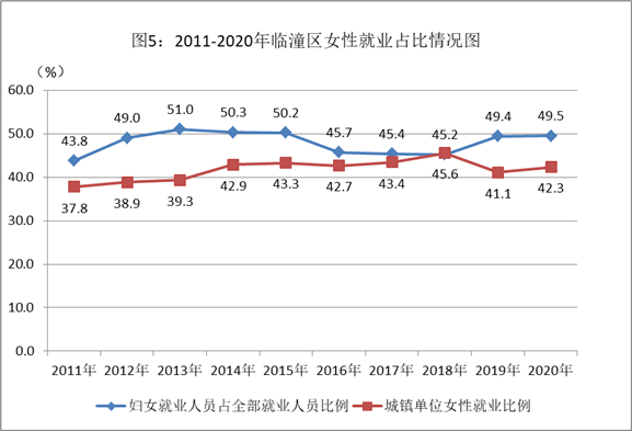 1、妇女就业人数稳步增长,男女非农就业差距不断缩小。十年来,全区女性就业人员稳步上升,截至2020年底,全区就业人员44.8万人,其中女性22.2万人,女性就业人员占全部就业人员的比重为49.5%,较2011年增加了5.7个百分点;城镇单位就业人员8.04万人,其中女性3.4万人,城镇单位女性就业人员占全部城镇单位全部就业人员数的42.3%,较2011年增加了4.5个百分点。全区女性的工作权利得到了充分保障。