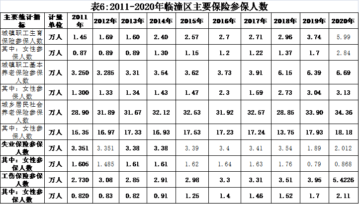 1、妇女参保人数稳步增多。十年来,全区医疗保健设施不断完善,医疗保险力度不断加大,全区参保人数稳步增加。2020年,全区城镇职工基本养老保险参保人数6.69万人,较2011年增加了3.44万人,增长105.8%,年均增长8.4%,其中女性参保人员3.13万人,较2011年增加1.83万人,增长140.8%,年均增长10.3%;城乡居民社会养老保险参保人数34.36万人,较2011年增加了5.46万人,增长18.9%,年均增长1.94%,其中女性参保人数18.18万人,较2011年增加了2.83万人,增长18.7%,年均增长1.92%;城镇职工基本医疗保险参保人数5.99万人,较2012年增加了1.39万人,增长30.2%,年均增长3.4%,其中女性2.84万人,较2012年增加了1.64万人,增长136.7%,年均增长10.1%。全区工伤保险参保人数5.42万人,较2011年增加了2.69万人,增长98.5%,年均增长7.9%,其中女性2.11万人,较2011年增加1.29万人,增长157.3%,年均增长11.1%。
