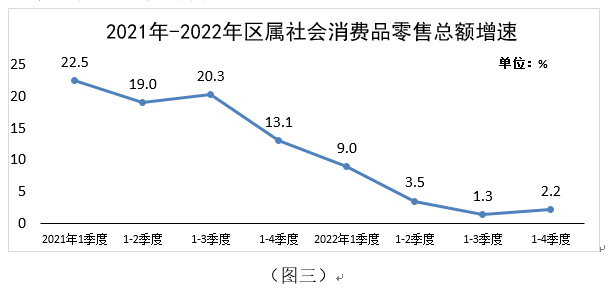 2022年,区属社会消费品零售总额同比增长2.2%,增速较上年回落10.9个百分点。