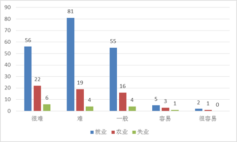 1.就业难仍是主基调。275名劳动力人口对2019年就业形势进行评价,分别有59.8%、55.7%和66.7%的就业人口、农业人口、失业人口评价就业形势难或非常难,其中失业人口经历过找工作、失业再就业的反复,更加感受到了就业的艰难;分别有36.6%、37.7%、27.7%的就业人口、农业人品、失业人口评价就业形势为一般;评价容易的仅为6%左右(见图2)。