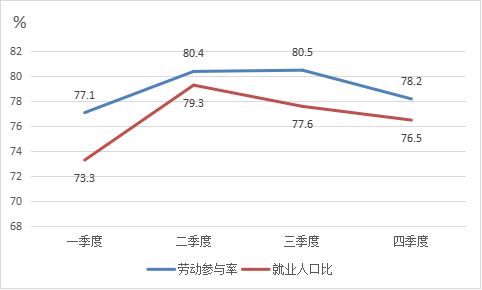 1.劳动力参与率和就业人口比总体平稳。2021年1-12月临潼劳动参与率为79.4%,同比下降0.8个百分点。人口就业比为77.2%,同比下降0.3个百分点。2021年国内疫情多次反复,加之十四届全国运动会在西安召开,影响部分行业停工,造成了劳动力市场活跃度不高,总体不如去年,临潼区委区政府出台一系列稳岗就业的措施,解决就业难的问题,四季度劳动力参与率为78.2%,比一季度增加了1.1个百分点,四季度就业人口比76.5%,比一季度增加3.2个百分点,全年劳动力市场活跃度有所回升。