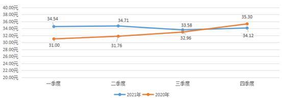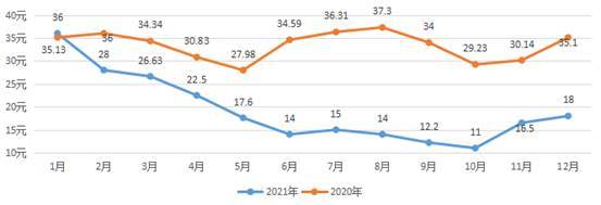 3.生猪价格持续走低,生猪养殖深度亏损。2021年生猪供应过剩,价格持续下跌,从1月份的36.00元/公斤,一路下跌,到10月份生猪出售价格跌至11.00元/公斤,为今年最低,进入四季度生猪价格开始回升,生猪出售价格为18.00元/公斤,比10月份上涨63.6%,较上年同期的35.10元/公斤下跌48.7%。