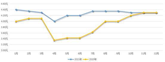 2.牛奶价格上涨。2021年牛奶价格高于上年,图2是调查的一家大型奶牛场的牛奶出售价格,全年牛奶价格在4.00—4.40元/公斤之间,一、二、三、四季度牛奶平均价格分别比上年同期上涨6.9%、22.4%、16.9%、0.7%。牛奶价格上涨的主要因素是饲料价格上涨带来的成本上涨,四季度平均每公斤牛奶成本3.92元,同比增加0.50元,上涨14.6%,其中平均每公斤牛奶饲料成本2.71元,同比增加0.52元,上涨23.7%。
