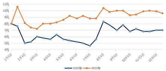 2.成本推动鸡蛋价格上涨。2021年饲料大幅上涨,鸡蛋生产成本上升30%左右,每公斤鸡蛋成本达到8.00元,春节后,鸡蛋价格下跌到8.00元/公斤以下,养殖户一度进入亏损区,淘汰增加,补栏延迟,产蛋鸡存栏下降,3月份鸡蛋价格跌到7.20元/公斤,触底回升,到8月价格上涨到10.00元/公斤以上。四季度,养殖户出售鸡蛋平均价格为9.50元/公斤,较去年同期的6.88元/公斤上涨38.1%,养殖效益好于去年同期。