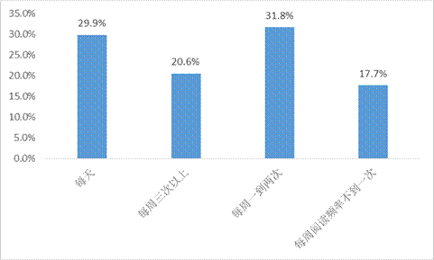 从居民阅读频率来看,有17.7%的居民表示平均每周阅读频率不到一次, 31.8%的人表示每周阅读频率一到两次,20.6%的人每周会阅读三次以上,仅29.9%的人每天会阅读。阅读频次不高反映出人们的阅读习惯还未完全养成。