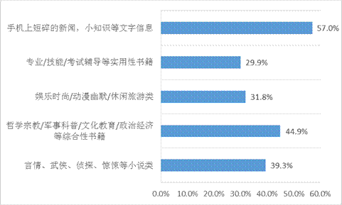 受访者喜爱阅读的内容丰富多样,读者更喜欢快速获得信息、小知识等。喜欢看手机上短碎的新闻、小知识等文字信息,占57%;喜欢看哲学宗教/军事科普/文化教育/政治经济等综合性书籍占比44.9%;喜欢看言情、武侠、侦探、惊悚等小说类占比39.3%;喜欢看娱乐时尚/动漫幽默/休闲旅游类占比31.8%;喜欢专业/技能/考试辅导等实用性书籍占比29.9%。可以看出人们平时阅读目的休闲娱乐较多,喜欢看手机短碎阅读占比高,但是由于手机阅读内容相对浅显,阅读时间相对碎片化,阅读内容碎片化信息较多、涉猎混杂,所以容易造成手机阅读的浮躁和功利性,缺少深读静思之美。因此读者要学会有效利用碎片化时间规划出整体化的阅读,来弥补不足。