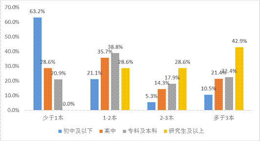 关于临潼居民2021年的阅读量调查结果如下:看书多于3本的占比21.5%,阅读量在2-3本的占比15.9%,阅读量在1-2本的占比34.6%,阅读量低于一本的占比28%。2020年我国成年国民人均纸质图书阅读量为4.70本,可以看出临潼居民的阅读量较少。从图三可以看出,居民文化程度与阅读量呈现正相关关系,文化程度越高,年阅读量越多。21年阅读量多于三本的其中文化程度是研究生以上的人数占比42.9%,21年阅读量少于一本的其中文化程度是初中及以下的人数占比63.2%。