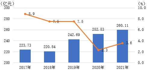图1:2017-2021年临潼生产总值