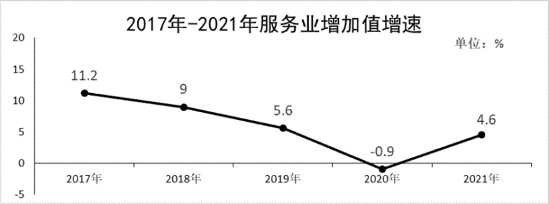 2021年,服务业(第三产业)增加值149.46亿元,增长4.6%。全年批发和零售业增加值13.59亿元,下降2.9%;交通运输、仓储及邮政业增加值4.16亿元,增长0.5%;住宿和餐饮业增加值5.06亿元,下降2.7%;金融业增加值15.94亿元,增长6.2%;房地产业增加值27.37亿元,增长0.8%;其他服务业增加值78.26亿元,增长7.4%。全年规模以上服务业[4]企业营业收入7.38亿元,比上年增长16.8%。