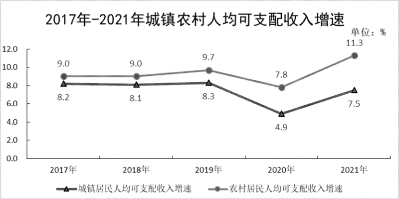 2021年,全年全区居民人均可支配收入23343元,比上年名义增长9.8%。其中,城镇常住居民人均可支配收入34744元,比上年名义增长7.5%;农村常住居民人均可支配收入17588元,比上年名义增长11.3%。