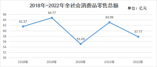 2022年,全年社会消费品零售总额57.77亿元,比上年下降8.4%。其中,限额以上企业(单位)[5]消费品零售额10.64亿元, 增长2.5%。