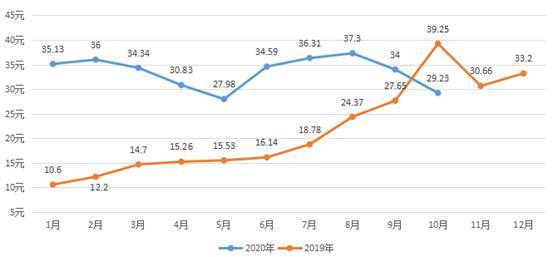 9、10月份,生猪价格持续下跌,基本上从9月上旬的36.60元/公斤一路下跌,到11月上旬生猪价格下跌到27.20元/公斤,比9月上旬下跌9.40元。据生猪监测数据,10月份生猪平均出售价格为29.23元/公斤,环比下跌了14.0%,比去年同期下跌了25.5%,生猪出售价格同比是20个月以来的首次下跌。