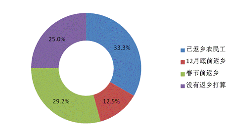 调查数据显示返乡农民工约为三成,返乡农民工占受访农民工33.3%,暂未返乡占受访农民工66.7%(其中,12月底前返乡占受访农民工12.5%,春节前返乡占29.2%,没有返乡打算占25%)。