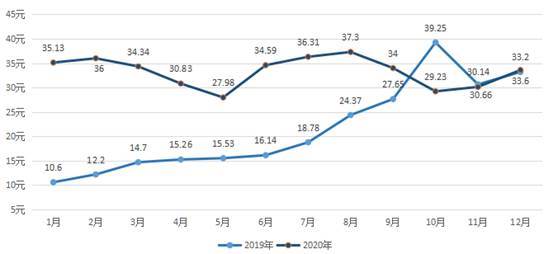 2.生猪价格高位运行。今年生猪价格始终处于高位运行,四季度随生猪产能的逐渐释放,市场供应适度增加,生猪价格有所回落。10月养殖户出售生猪平均价格为29.23元/公斤,月环比下跌14.0%。四季度规模户生猪平均出售价格为31.19元/公斤,环比下跌13.7%,同比下跌5.3%。