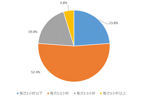 在被问及“老师布置由家长帮助完成作业花费时间”时,52.4%的家长花费时间在1-2小时/次,23.8%的家长花费时间在1小时/次以下,19.0%的家长花费时间在2-3小时/次;仅有一人花费时间在3小时/次以上,占比为4.8%。