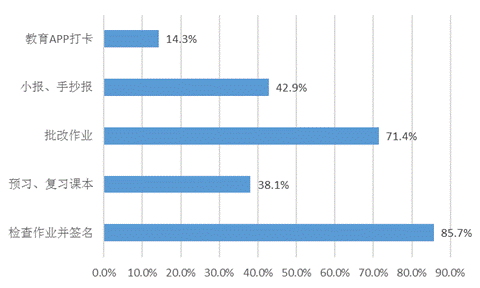 调查显示,记账帮助孩子完成家庭作业的主要内容集中在检查作业完成并签名和批改作业并纠正孩子的错误,分别占比为85.7%、71.4%。其次为做手抄报和预习课文,分别占比42.9%、38.1%。