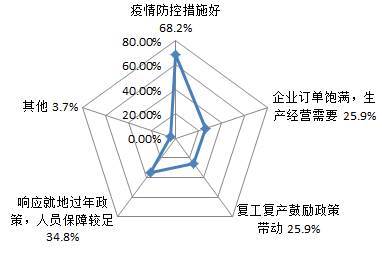 随着疫情防控形势不断向好,企业员工响应“就地过年”政策等因素影响,疫情对企业冲击正逐步减弱。调查显示,83.7%的企业春节后复工时间和疫情前一样或更早;15.6%的企业复工时间比去年早但晚于疫情前年份。疫情防控措施好、响应“就地过年”人员保障充足、企业订单饱满、复工复产鼓励政策支持是企业复工良好的重要保障,分别占被调查企业的68.2%、34.8%、25.9%和25.9%(图2)。