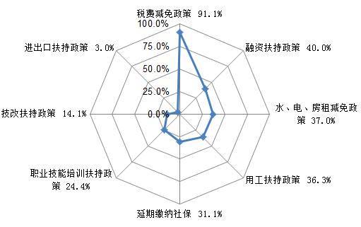 调查显示,企业希望政府对生产经营提供多方面扶持。91.1%的企业希望得到“税费减免政策”,40.0%的企业希望得到“融资扶持政策”,37.0%的企业的企业希望得到“水、电、房租减免政策”,36.3%的企业希望得到“用工扶持政策”,31.1%的企业希望“延期缴纳社保”(图4)。
