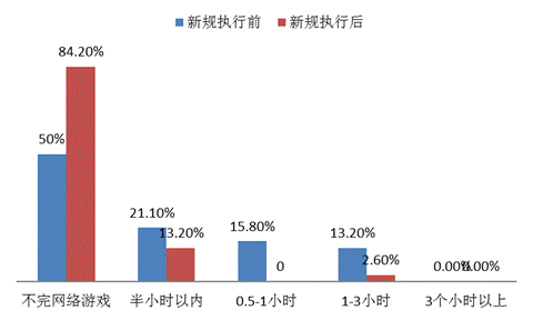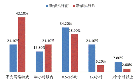 一是新规执行后游戏时长明显减少。63%的学生表示新规执行后自己的游戏时间减少,其中大幅减少的占比50%。具体来看:新规执行前周一至周四时间段,不玩网络游戏的人数为19人,新规执行后增加到32人,增长68.4%;执行前游戏时长在1-3小时的有5人,执行后仅有1人。新规执行前周五至周日及节假日时间段,不完网络游戏的有8人,新规执行后增加到16人,增长了100%,执行前游戏时长在3小时以上的有3人,执行后仅为1人;执行前游戏时长在1-3小时的有8人,执行后仅有2人。