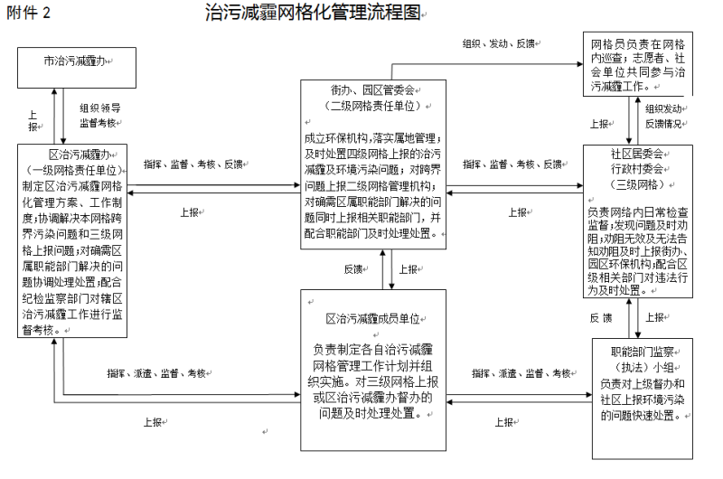 (二)明确责任,层级管理。建立三级网格化层级管理机制,落实网格化区域划分,明确责任分工,细化管理标准,逐级对治污减霾工作进行检查执法、督促和指导,协调解决存在问题。