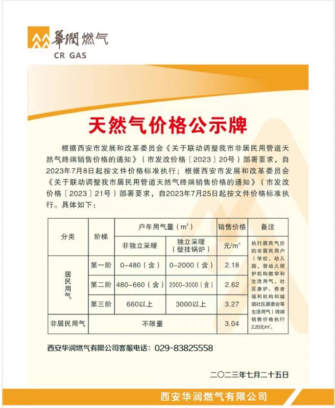 西安市华润燃气有限公司公示信息,包括位于西安市临潼区行者街办小寨村,联系电话029 - 83827200及价格公示